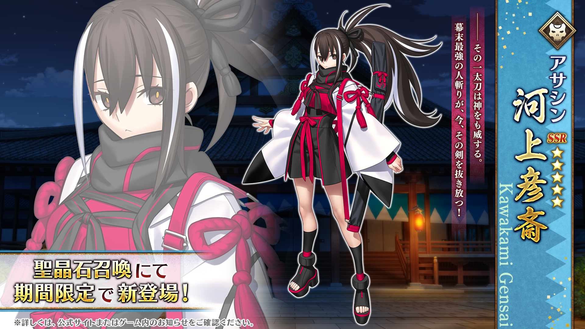 新登場の期間限定サーヴァント「★5(SSR)河上彦斎」「★4(SR)藤堂平助」と期間限定概念礼装3種をピックアップした聖晶石召喚を開催いたします。