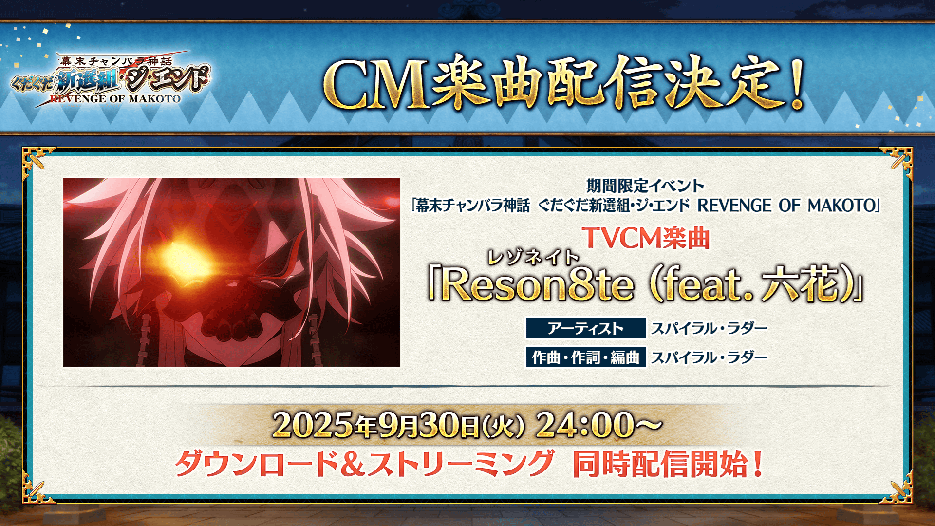 期間限定イベント「幕末チャンバラ神話 ぐだぐだ新選組・ジ・エンド REVENGE OF MAKOTO」 TVCM楽曲「Reson8te (feat. 六花)」のダウンロード&ストリーミング配信が決定いたしました。