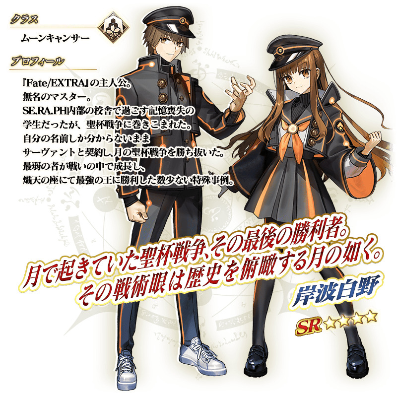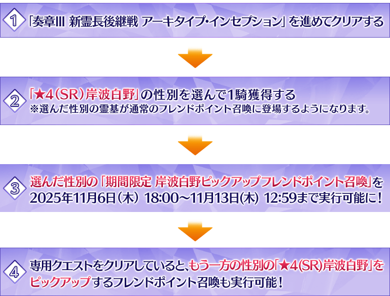 ※「期間限定 岸波白野ピックアップフレンドポイント召喚」から登場する★4(SR)サーヴァントは、専用クエストのクリア状況によって排出対象が変わります。
