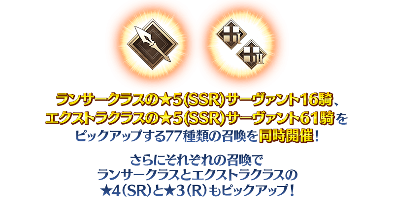 期間限定『「冠位戴冠戦:Lancer」&「冠位戴冠戦:Extra」ストーム・ポッド消費0!キャンペーン』にあわせて、期間限定サーヴァントを含むランサークラス43騎、エクストラクラス80騎をピックアップする77種類の召喚を同時開催いたします!