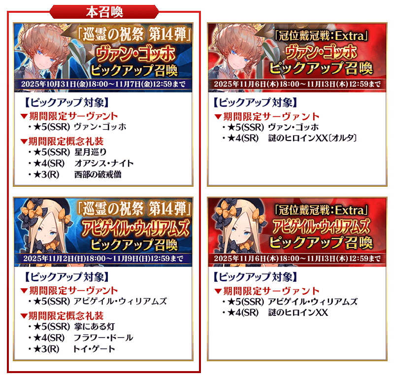 「★5(SSR)ヴァン・ゴッホ」「★5(SSR)アビゲイル・ウィリアムズ」は『「巡霊の祝祭 第14弾」ピックアップ召喚』でピックアップされるほかに、11月6日(木) 18:00より開催されている『「冠位戴冠戦:Lancer」&「冠位戴冠戦:Extra」ピックアップ召喚』でもピックアップされます。