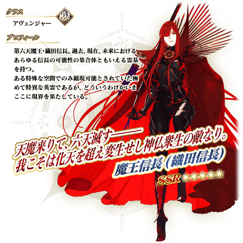 ※上記の「★5(SSR)魔王信長(織田信長)」のイラストとセイントグラフは霊基再臨第3段階のものです。 ※「★5(SSR)魔王信長(織田信長)」は「★5(SSR)織田信長」を霊基再臨第3段階にすることで名称が「★5(SSR)魔王信長」に変化します。