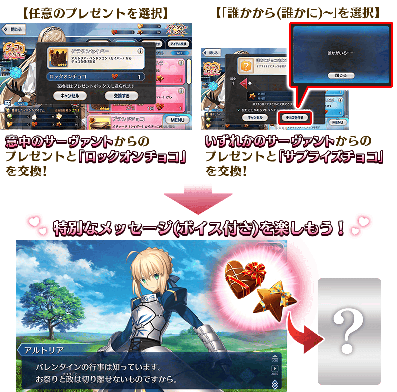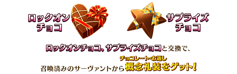 ・ロックオンチョコ:召喚済みのサーヴァントの中から任意に選択して、概念礼装(チョコレート・お返し)を交換することができます。 ・サプライズチョコ:召喚済みのサーヴァントの中からいずれかランダムにて、概念礼装(チョコレート・お返し)を交換することができます。