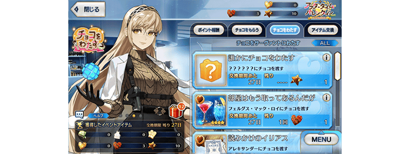豊穣ポイント報酬として獲得した「ロックオンチョコ」「サプライズチョコ」は、イベントアイテム交換の「チョコをもらう」「チョコをわたす」で概念礼装(チョコレート・お返し)と交換することができます。