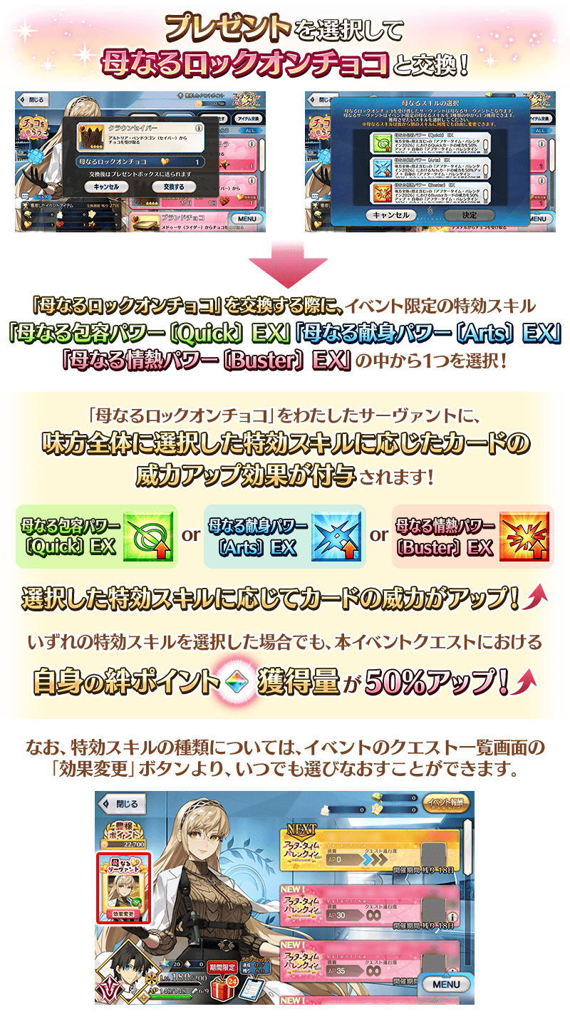 また本イベントではイベント限定の特効スキル「母なる包容パワー〔Quick〕 EX」「母なる献身パワー〔Arts〕 EX」「母なる情熱パワー〔Buster〕 EX」を付与できる「母なるロックオンチョコ」も登場!