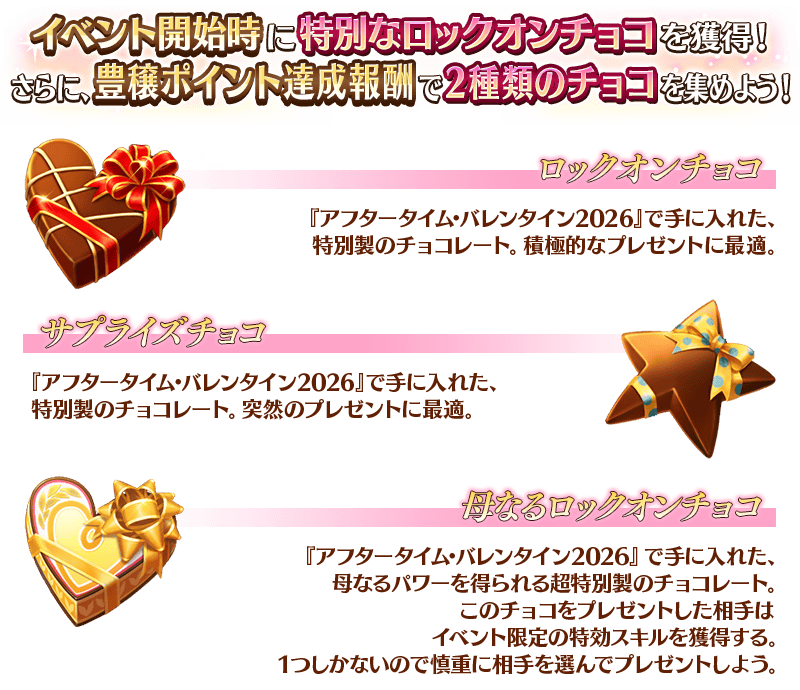 「ロックオンチョコ」「サプライズチョコ」のほか、イベント限定コマンドコードや伝承結晶などを獲得可能です。