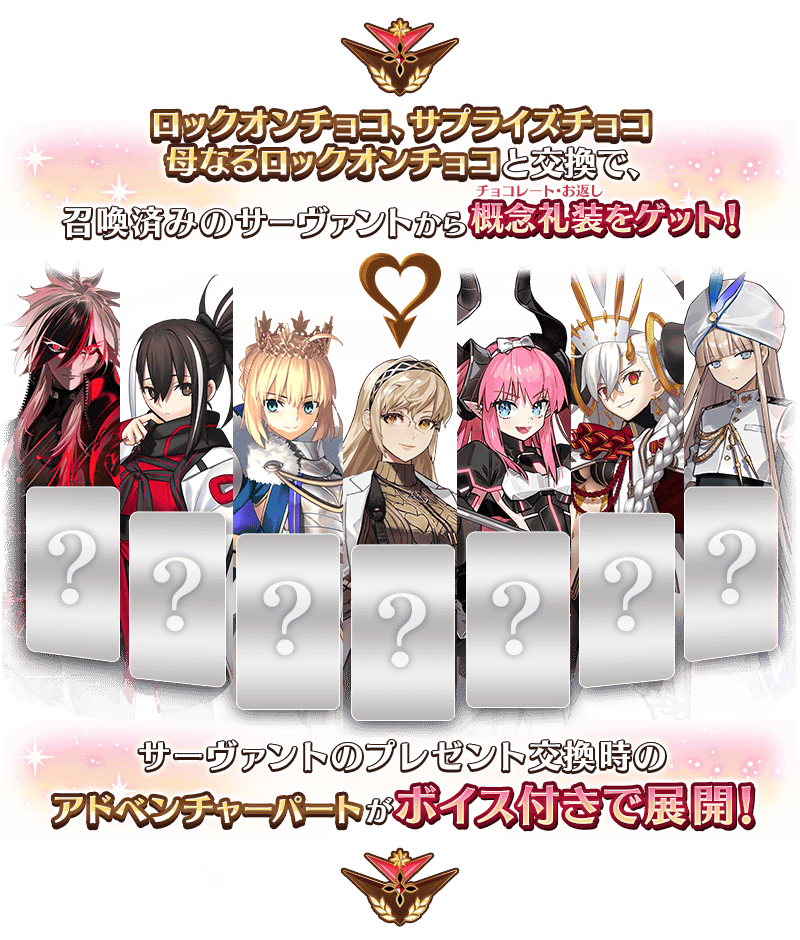 ※霊基封印の対象サーヴァントから概念礼装(チョコレート・お返し)をもらうイベントでは、封印解除後のネタバレを一部含むことがありますので、あらかじめご注意ください。 ※本イベントでは、概念礼装(チョコレート・お返し)を受け取る際のアドベンチャーパート開始前に都度必要なボイスをダウンロードしており、従来よりもデータ通信量が増加します。詳しくはこちらのお知らせをご覧ください。 ※本ページの画像はすべて開発中のものです。実際の画像とは異なる場合があります。 ※2019年1月1日(火) 0:00以降に新たに配信されるメインストーリー、期間限定イベント、一部クエスト、キャンペーンおよび召喚では、真名隠し対象サーヴァントの真名が表示されます。 ※「マテリアル(ギャラリー)」に本イベントのイベントCGやムービーが追加されるのは、2026年3月6日(金) 13:00からとなります。 ※一部のクエストは後日開放されます。
