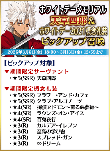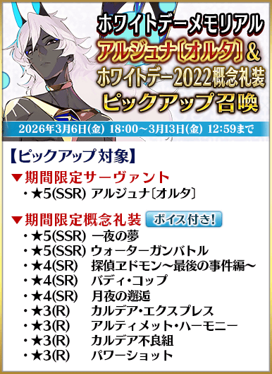 【ボイス付きの概念礼装がピックアップされる召喚一覧】 ・ホワイトデーメモリアル ダンテ・アリギエーリ&ホワイトデー2025概念礼装ピックアップ召喚 ・ホワイトデーメモリアル シャルルマーニュ&ホワイトデー2024概念礼装ピックアップ召喚 ・ホワイトデーメモリアル 高杉晋作&ホワイトデー2023概念礼装ピックアップ召喚 ・ホワイトデーメモリアル アルジュナ〔オルタ〕&ホワイトデー2022概念礼装ピックアップ召喚