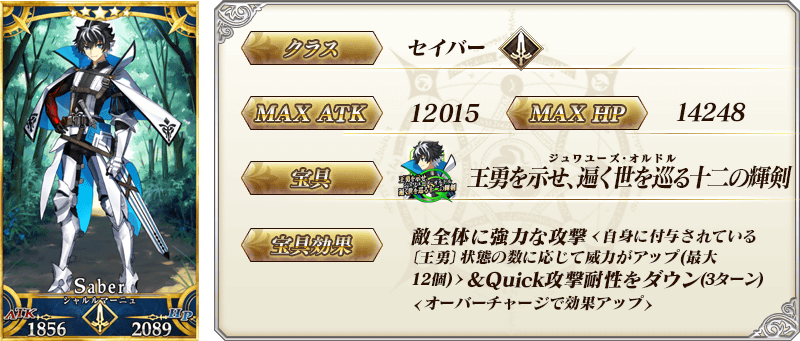 ◆最大解放時効果◆ 自身のArtsカードの性能を12%アップ&Busterカードの性能を12%アップ&Quickカードの性能を12%アップ |