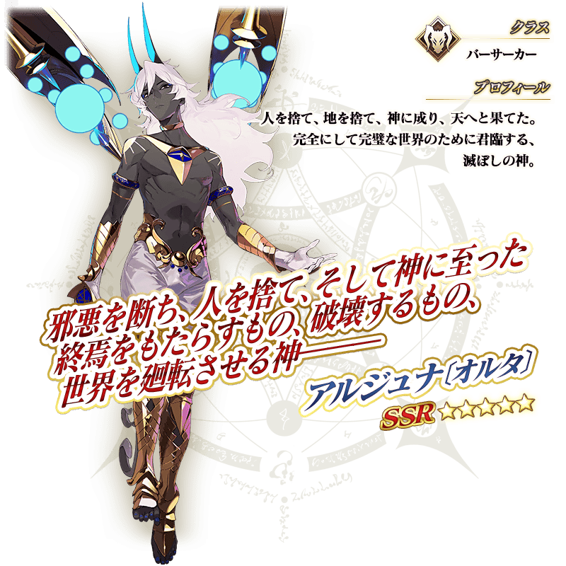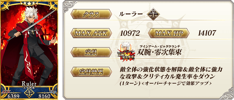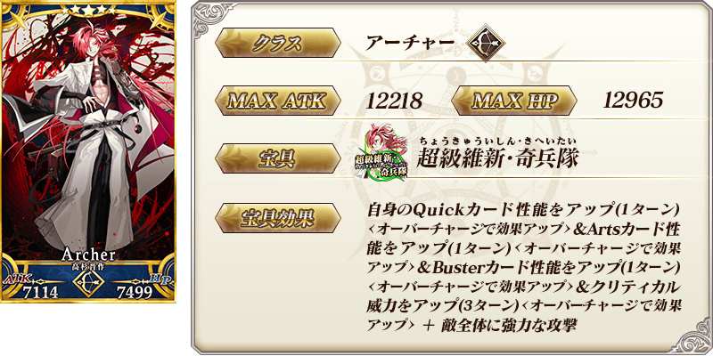 ◆最大解放時効果◆ 自身のQuickカードの性能を3%アップ&Artsカードの性能を3%アップ&Busterカードの性能を3%アップ&精神異常付与成功率を5%アップ |