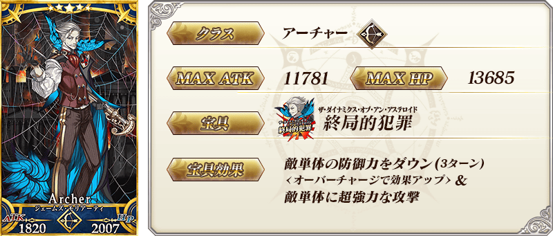 ◆最大解放時効果◆ 自身のクリティカル威力を20%アップ&宝具威力を20%アップ&魅了付与成功率を15%アップ |