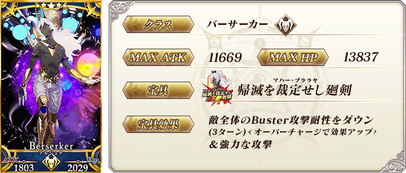 ◆最大解放時効果◆ 自身のArtsカード性能を10%アップ&Busterカード性能を10%アップ&弱体付与成功率を5%アップ |