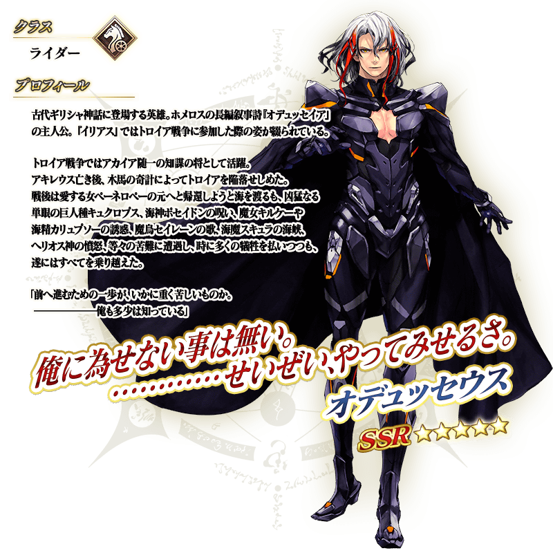 ※上記の「★5(SSR)オデュッセウス」のイラストは霊基再臨第2段階のものです。 ※上記の「★5(SSR)オデュッセウス」のセイントグラフは、簡易霊衣「アイギス(第二再臨)」開放前の霊基再臨第2段階のものです。 ※簡易霊衣「アイギス(第二再臨)」を開放すると、「★5(SSR)オデュッセウス」の霊基再臨第2段階のセイントグラフとフェイス画像が顔を出している状態のものに変化し、上記のセイントグラフは簡易霊衣「アイギス(第二再臨)」のものになります。