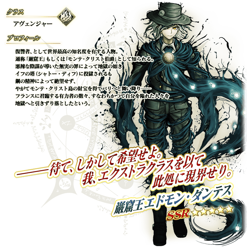 ※上記の「★5(SSR)巌窟王 エドモン・ダンテス」のイラストとセイントグラフは霊基再臨第2段階のものです。