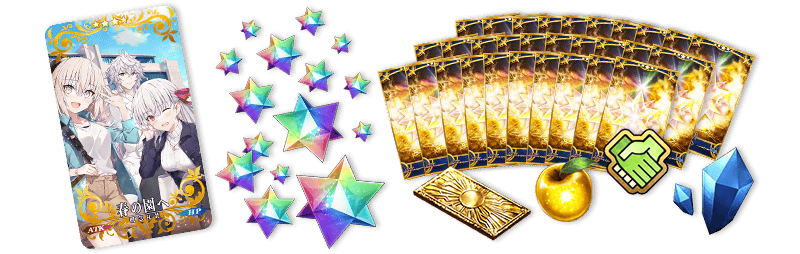 ・聖晶石 30個(聖晶石召喚最大11回分) ・フレンドポイント 合計14,000pt(フレンドポイント召喚70回分) ・叡智の業火ALL★5(SSR) 18枚 ・黄金の果実 18個 ※「(聖晶石召喚最大11回分)」は、同一の聖晶石召喚をおこなった場合に限ります。
