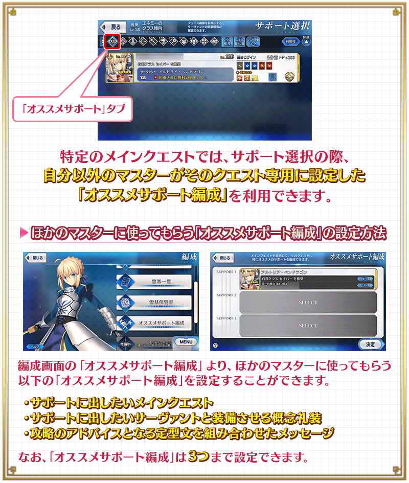 オススメサポート編成を設定しておくと、フレンドかどうかに関わらず、該当クエストに挑戦した際にすべてのマスターのサポート編成(オススメタブ)に自分が設定したサーヴァントおよび概念礼装、メッセージが表示されます。