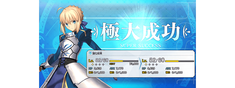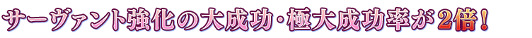 下記の期間中、サーヴァントの強化をおこなった際に、大成功(経験値2倍ボーナス)・極大成功(経験値3倍ボーナス)の発生率が期間限定で2倍になります!