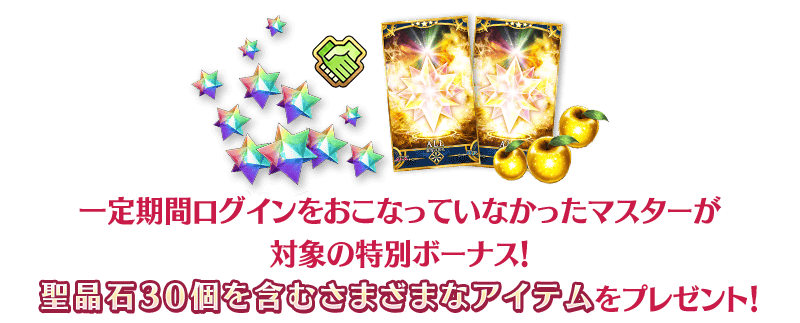 一定期間ログインをおこなっていなかったマスターを対象に、期間限定で「カムバックログインボーナス」を開催いたします。