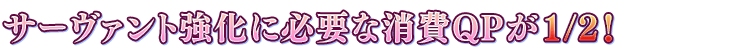 下記の期間中、サーヴァントを強化する際に必要なQPの消費量が、期間限定で1/2になります!