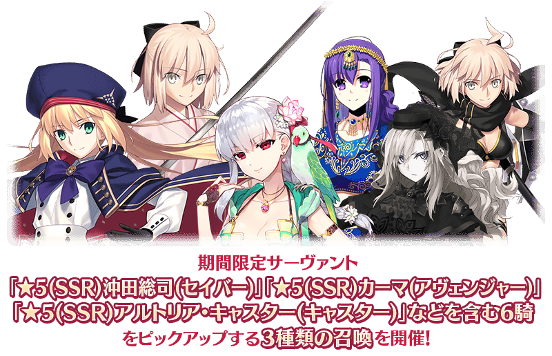 本召喚では、各召喚にてピックアップされている★5(SSR)サーヴァントのみが「確定召喚」による召喚の対象となります。