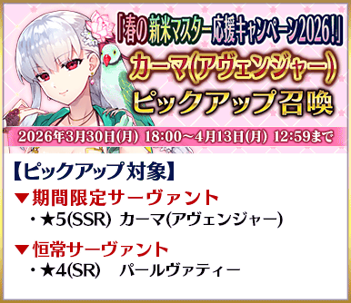 期間限定「Fate/Grand Order 春の新米マスター応援キャンペーン2026!」の開催を記念して、期間限定サーヴァント「★5(SSR)カーマ(アヴェンジャー)」などを含む6騎をピックアップする3種類の召喚を開催いたします!