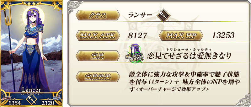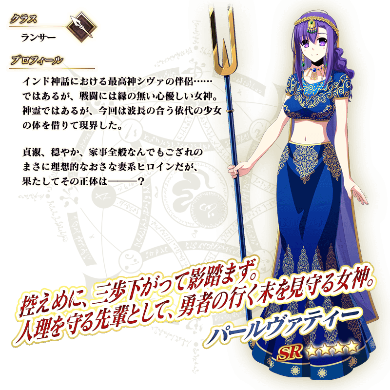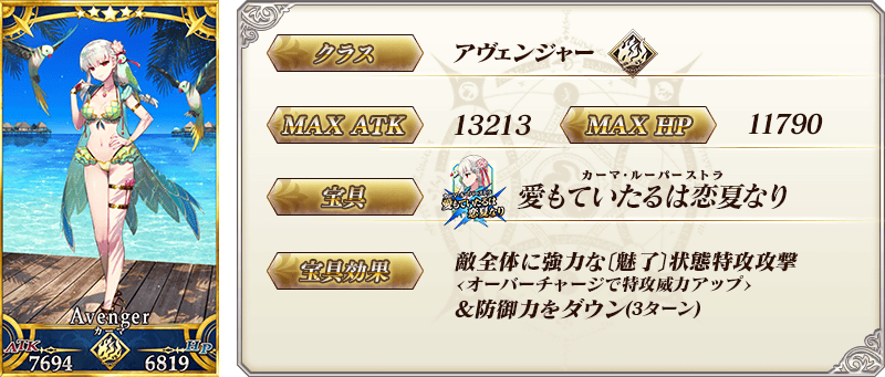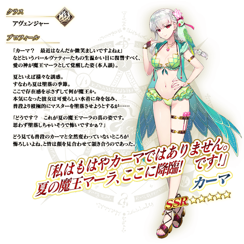※上記の「★5(SSR)カーマ(アヴェンジャー)」のイラストとセイントグラフは霊基再臨第2段階のものです。 ※「★5(SSR)カーマ(アヴェンジャー)」の宝具は再臨段階によって名称と演出が変化いたします。
