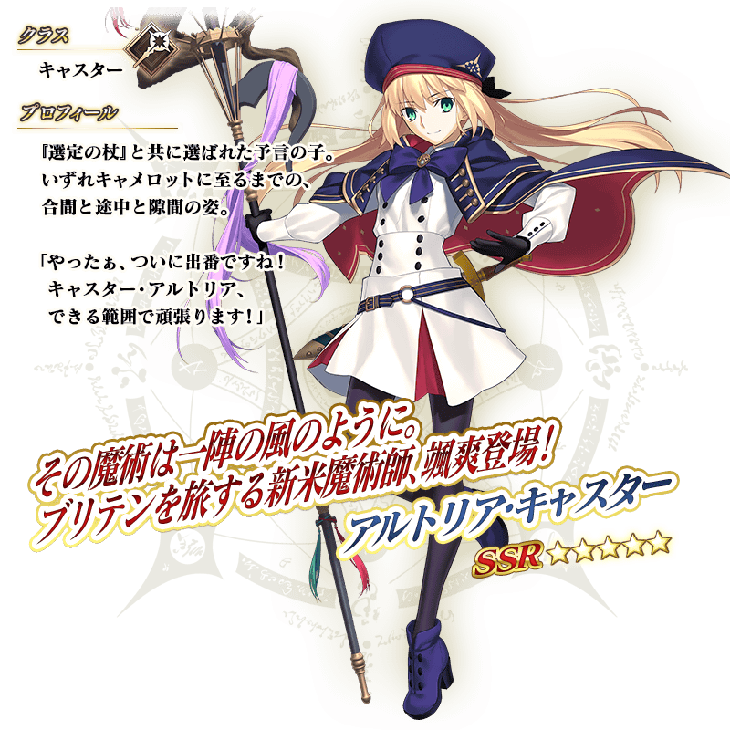※上記の「★5(SSR)アルトリア・キャスター(キャスター)」のイラストとセイントグラフは霊基再臨第2段階のものです。 ※「★5(SSR)アルトリア・キャスター(キャスター)」の宝具は再臨段階によって名称と演出が変化いたします。