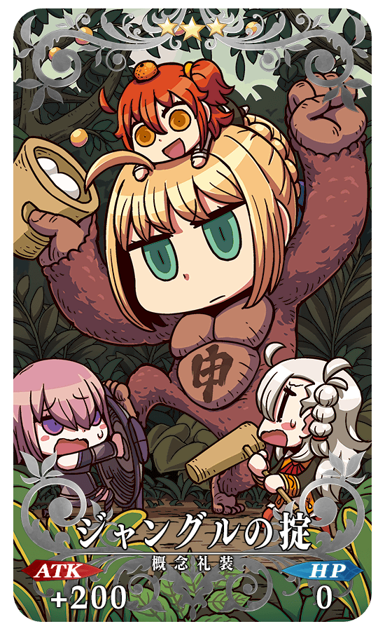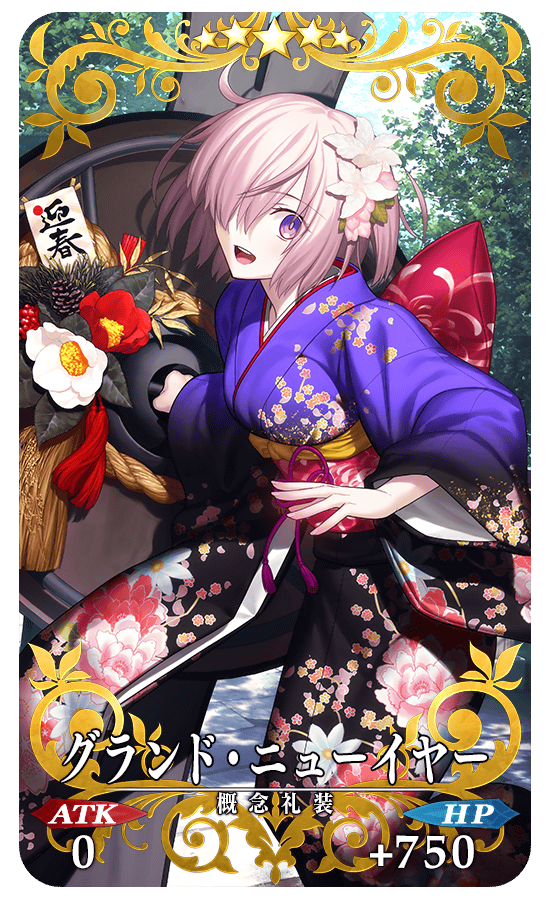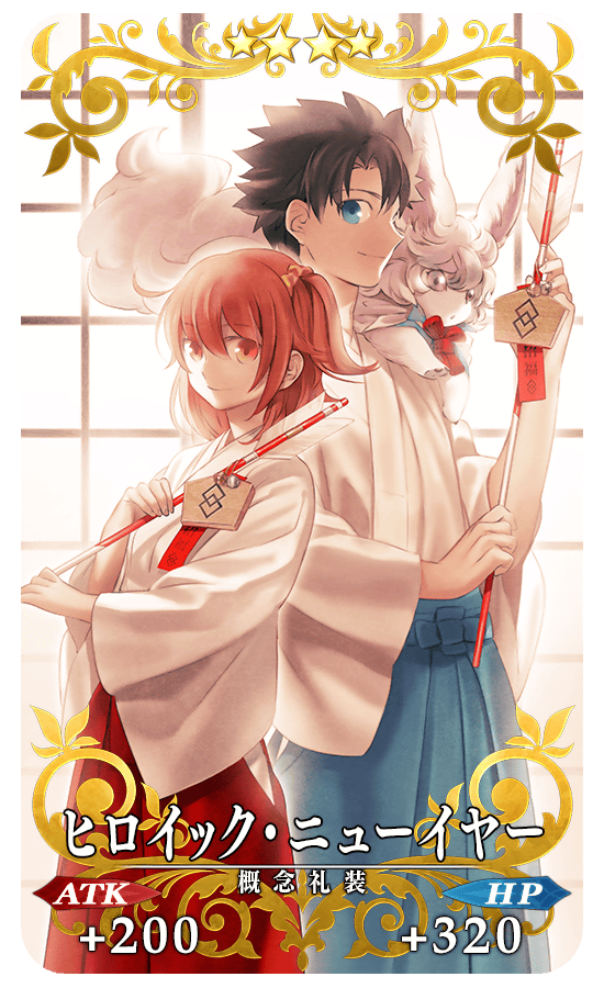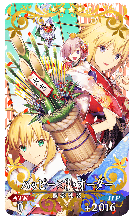 さらに、期間限定概念礼装「★5(SSR)グランド・ニューイヤー」、「★4(SR)ヒロイック・ニューイヤー」、「★3(R)2016年の平穏」、「★3(R)ジャングルの掟」も出現率がアップ。このタイミングでしか入手できないお正月限定の概念礼装です。