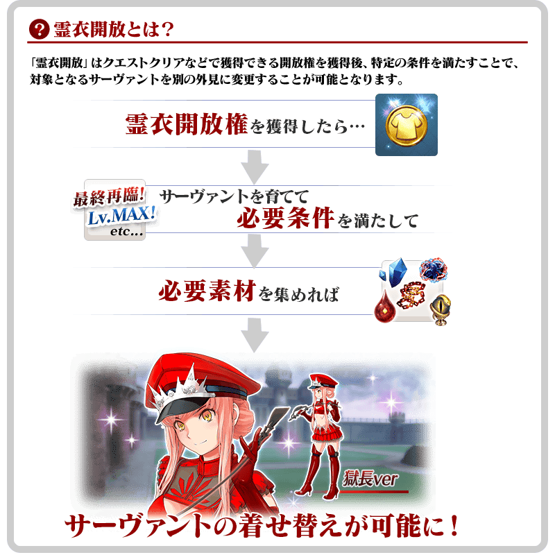 ※「霊衣開放」による変更はサーヴァントの外見のみでクラスやパラメータなどに変化はありません。