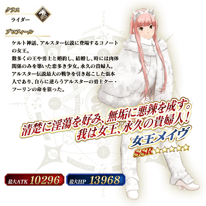 ※期間限定イベント「デスジェイル・サマーエスケイプ ~罪と絶望のメイヴ大監獄2017~」にて霊衣が追加されるサーヴァントは女王メイヴのみとなります。
