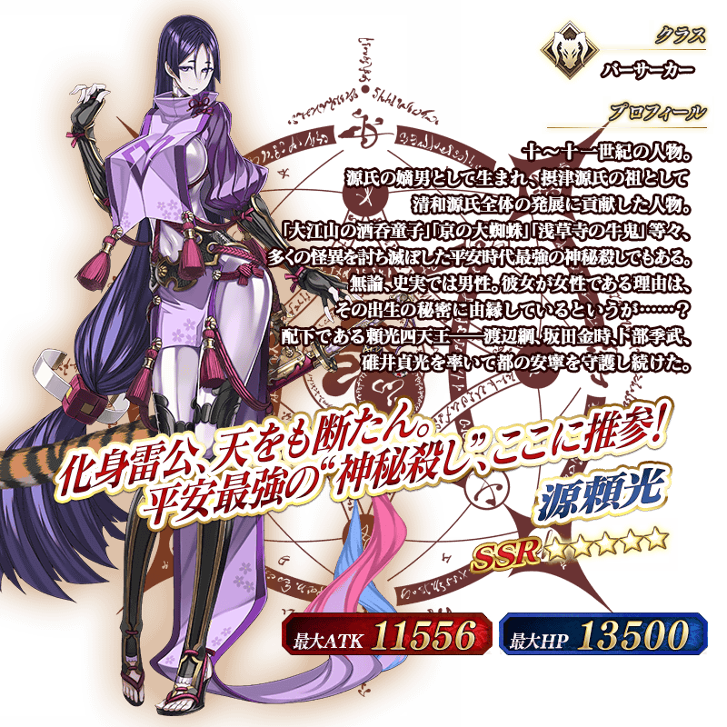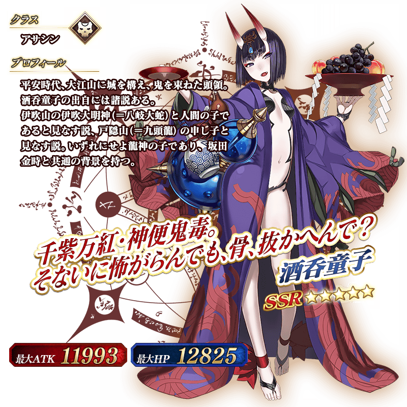 「Fate/Grand Order」公式サイト内のお知らせにて、「★5(SSR)酒呑童子」「★5(SSR)源頼光(バーサーカー)」「★4(SR)柳生但馬守宗矩」「★4(SR)加藤段蔵」の宝具演出を公開しております。あわせてご確認ください。