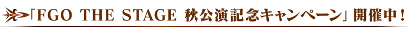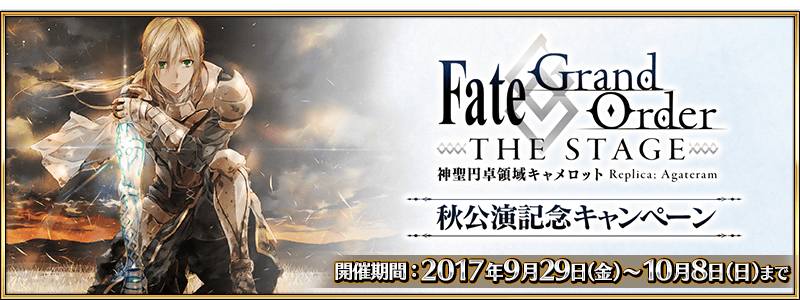 2017年9月29日(金)~10月8日(日) の期間に開催されている、舞台「Fate/Grand Order THE STAGE –神聖円卓領域キャメロット–」の公演を記念して、「FGO THE STAGE 秋公演記念キャンペーン」を開催中です!