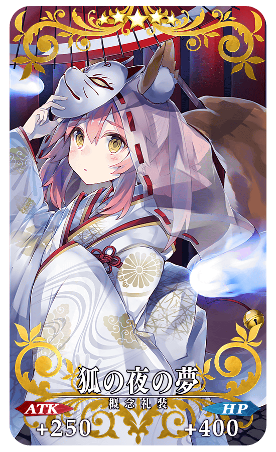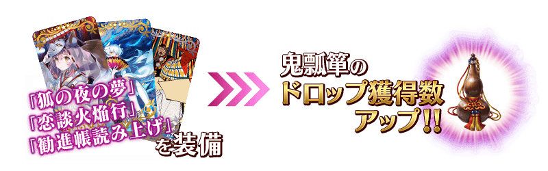 期間限定概念礼装「★5(SSR)狐の夜の夢」「★4(SR)恋談火焔行」「★3(R)勧進帳読み上げ」は装備することでイベントアイテム「鬼瓢箪」のドロップ獲得数が増加します。