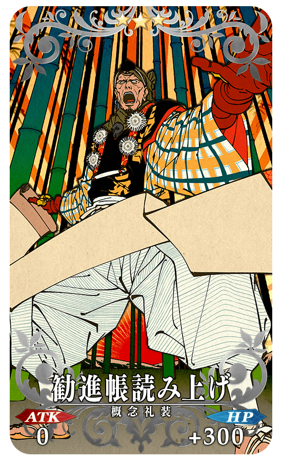★★★R 勧進帳読み上げ ATK 0 HP 300(最大:1500) スキル 自身に防御弱体無効状態を1回付与 + 鬼瓢箪のドロップ獲得数を1個増やす【『復刻:鬼哭酔夢魔京 羅生門 ショート版』イベント期間限定】