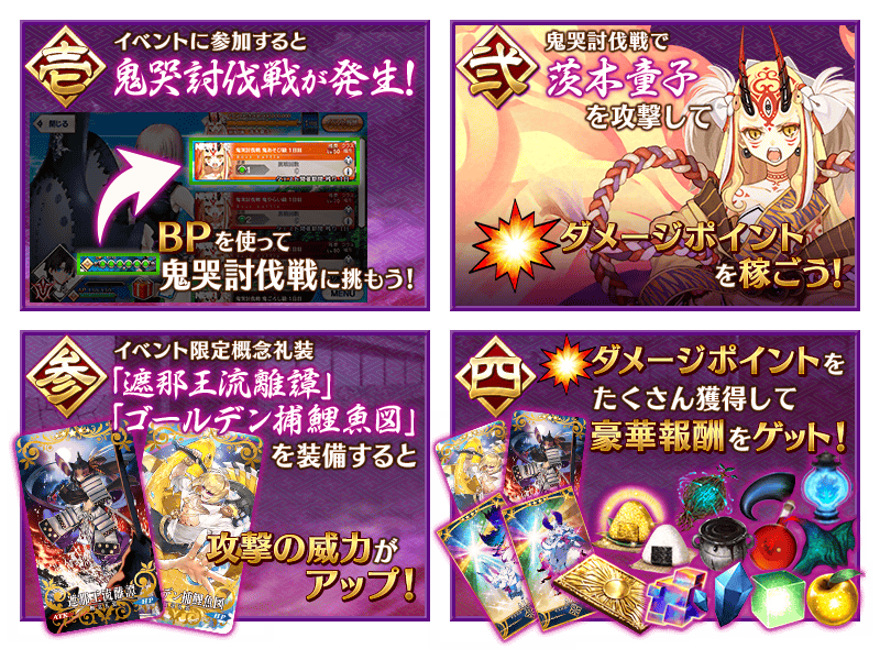このイベントでは、すべてのマスターと一緒に茨木童子の討伐に挑む特別なクエスト、鬼哭討伐戦が行われます。鬼哭討伐戦は、イベント期間中に複数回発生します。