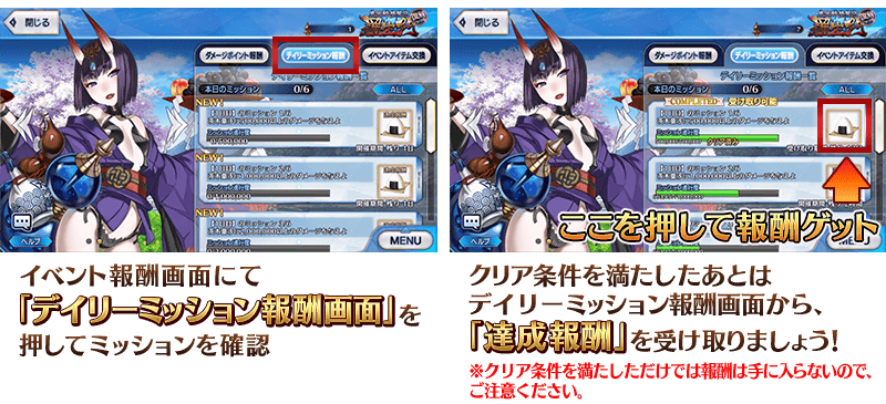 デイリーミッションは茨木童子の出現タイミングごとに開催期間が区切られた、期間限定のデイリーミッションとなります。