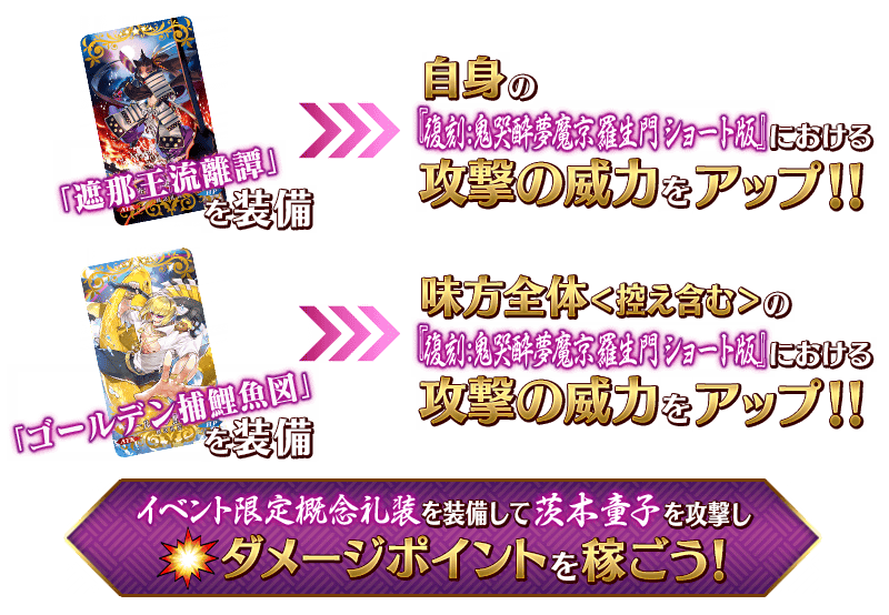 また、ダメージポイント報酬で入手できるイベント限定概念礼装「ゴールデン捕鯉魚図」を装備すると、「復刻:鬼哭酔夢魔京 羅生門 ショート版」における味方全体<控え含む>の攻撃の威力がアップします。