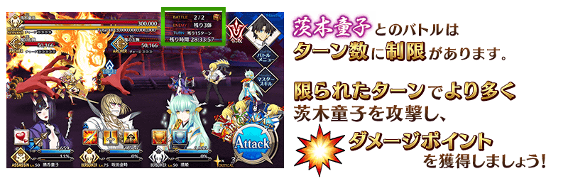 ※ダメージポイントは、茨木童子とのバトルに勝利したタイミング、バトルの残りターン数が0になった場合、バトルで敗北(パーティが全滅)した場合に加算されます。