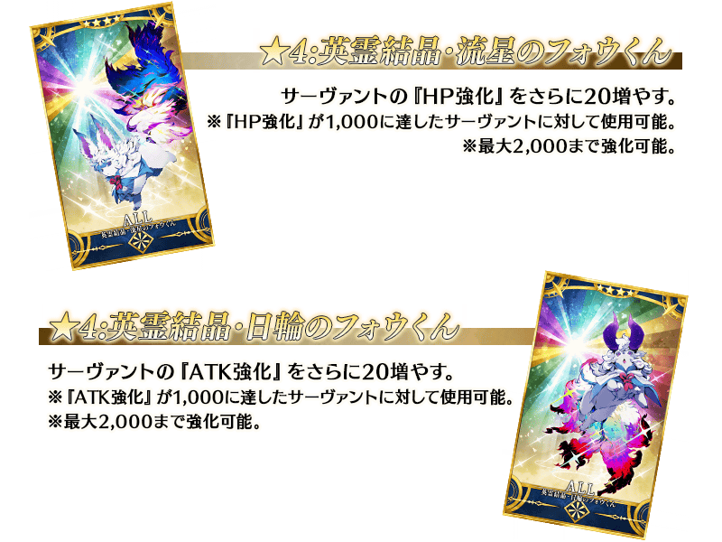 ※5月31日(水)のメンテナンス後、最初にログインを行ったタイミングで、HPおよびATKの強化値が990に達しているサーヴァントの数だけ、「英霊結晶・宵闇のフォウくんALL★1(HP)」と「英霊結晶・明けのフォウくんALL★1(ATK)」をプレゼントボックスに配布いたします。