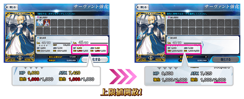 ※強化上限値2,000までの開放はサーヴァントの強化値を1,000にすることで自動的に開放されます。