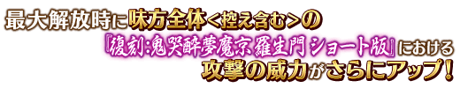 イベントアイテム交換やダメージポイント報酬で入手できるイベント限定概念礼装「遮那王流離譚」を装備すると、「復刻:鬼哭酔夢魔京 羅生門 ショート版」における自身の攻撃の威力がアップします。