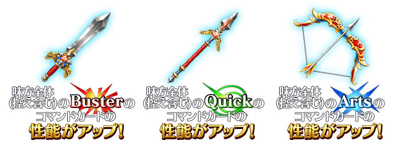 「勇者の剣」「勇者の槍」「勇者の弓」を使用すると、味方全体(控え含む)の「Buster」「Quick」「Arts」それぞれのコマンドカードの性能がアップします。