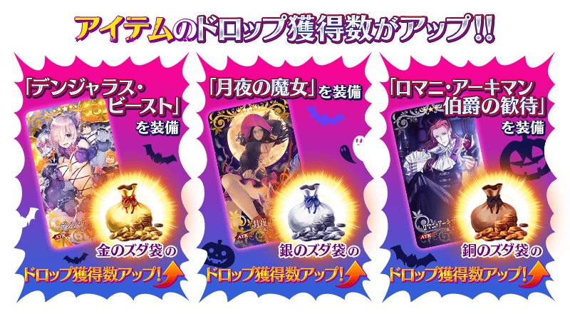 期間限定概念礼装「★5(SSR)デンジャラス・ビースト」「★4(SR)月夜の魔女」「★3(R)ロマニ・アーキマン伯爵の歓待」は装備することでイベント専用アイテムのドロップ獲得数がアップいたします。