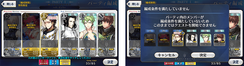 編成制限クエストは、男性サーヴァント限定など、サーヴァントの編成が制限される高難易度のクエストです。