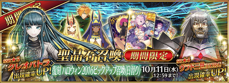 また、「復刻:ハロウィン・カムバック! 超極☆大かぼちゃ村 ~そして冒険へ……~ ライト版」で活躍する「★4(SR)ヴラド三世〔EXTRA〕」「★4(SR)ニトクリス(キャスター)」「★4(SR)茨木童子」を日替りでピックアップいたします!