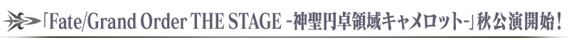 2017年9月29日(金) 18:00~10月8日(日) 23:59までの期間、舞台「Fate/Grand Order THE STAGE –神聖円卓領域キャメロット–」の秋公演を記念して「FGO THE STAGE 秋公演記念キャンペーン」を実施いたします!