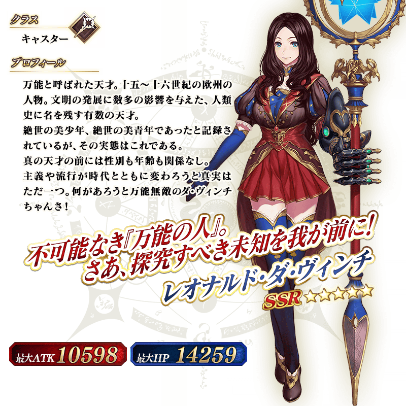 今回は、期間限定で「★5(SSR)レオナルド・ダ・ヴィンチ」をピックアップ!