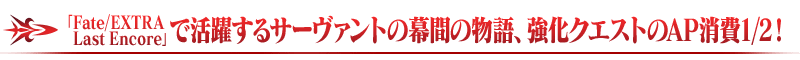 下記の期間中、「Fate/EXTRA Last Encore」で活躍するサーヴァントを対象に、幕間の物語および強化クエストのAP消費量が1/2となります。