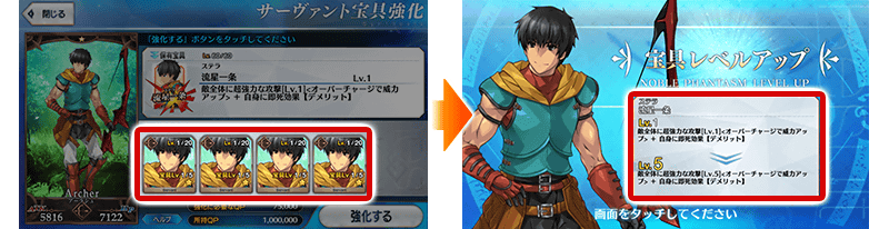 サーヴァントの宝具強化時に強化素材のカードを複数枚選択して、一度にまとめて宝具強化できるようになります。