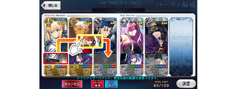 パーティ編成画面で、概念礼装もドラッグで配置変更できるように!